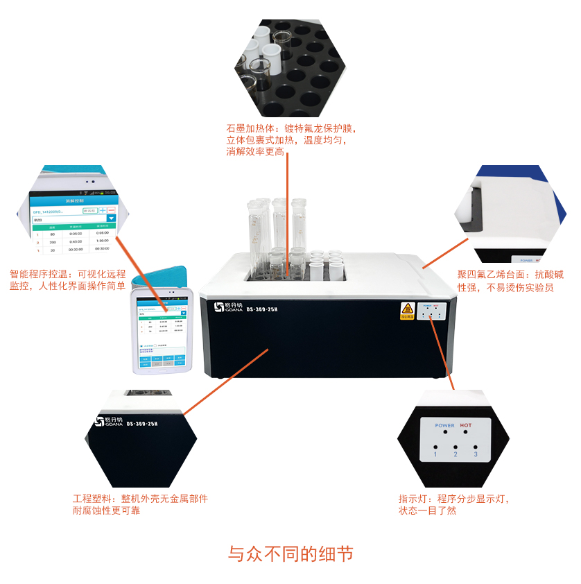 DS-360-25H高溫石墨消解儀具有無(wú)線控制技術(shù)實(shí)現(xiàn)遠(yuǎn)程操作實(shí)驗(yàn)、時(shí)刻掌握動(dòng)態(tài)。無(wú)線的設(shè)計(jì)讓操作者遠(yuǎn)離酸霧,避免對(duì)人體直接接觸,保障人員安全。高溫石墨消解儀儀器采用高純石墨作為加熱體,包裹式加熱,石墨材質(zhì)可以讓溫度更均勻,效率更高。多孔的設(shè)計(jì),輕松實(shí)現(xiàn)了批量的處理樣品,節(jié)省了大量的時(shí)間,提高工作效率,是您實(shí)驗(yàn)室樣品前處理消解的好伙伴。