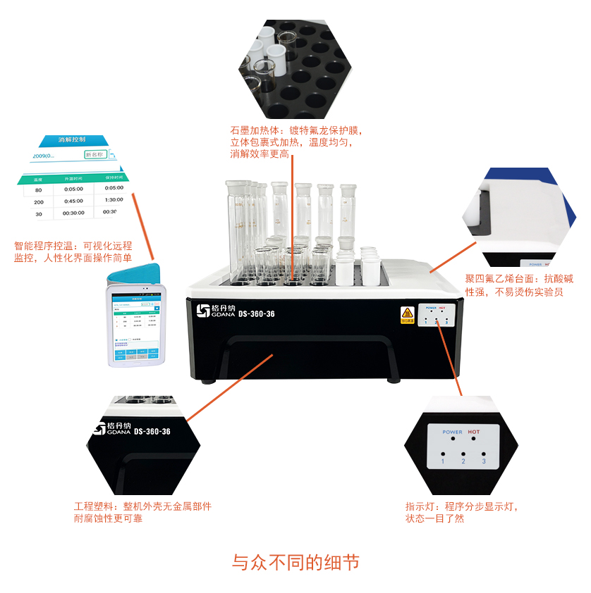 樣品前處理時間占整個分析測試時間約70%,DS-360石墨消解儀36孔樣品處理量,有效提高消解效率,節約前處理的等待時間,因而在發達國家的農業、食品、環境、疾控、科研等領域得到廣泛使用。