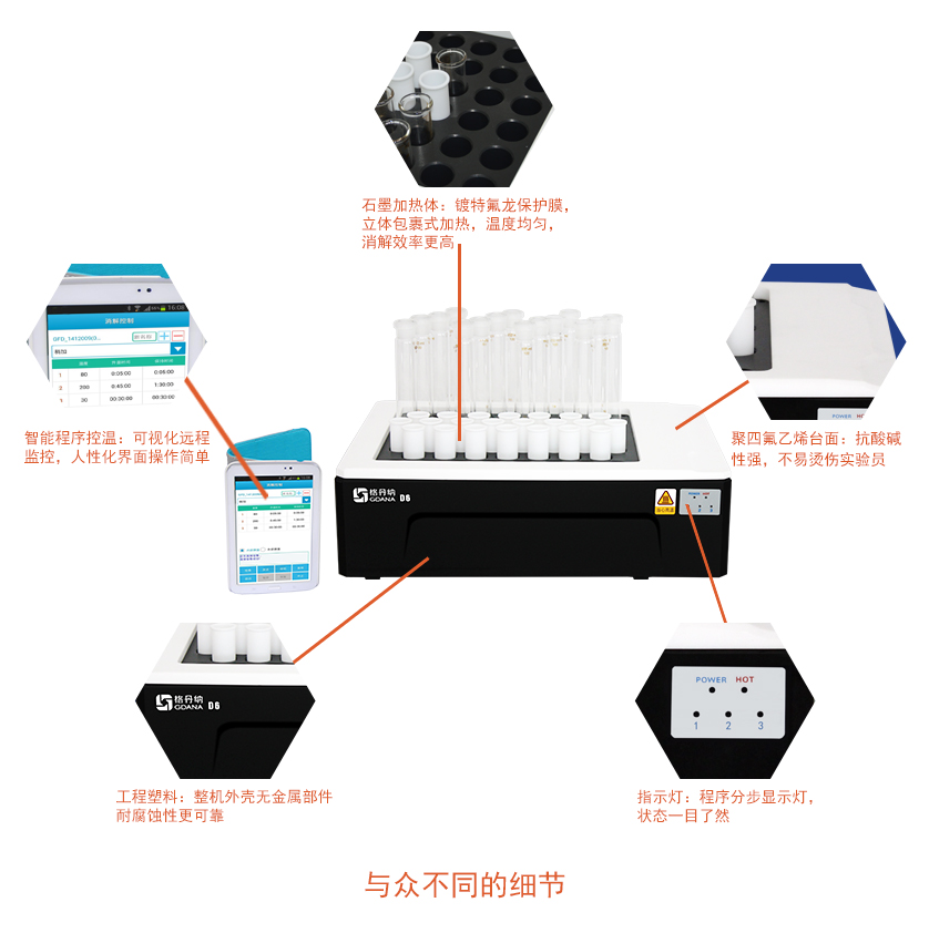 D6智能石墨消解儀采用高純石墨材料作為加熱體,包裹式加熱,效率更高,溫度均勻性更好。多孔設(shè)計,輕松實現(xiàn)樣品的批量處理,D6石墨消解儀是您樣品消解的好伴侶。