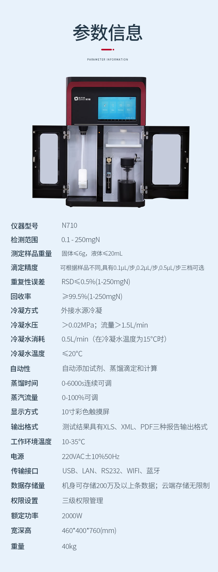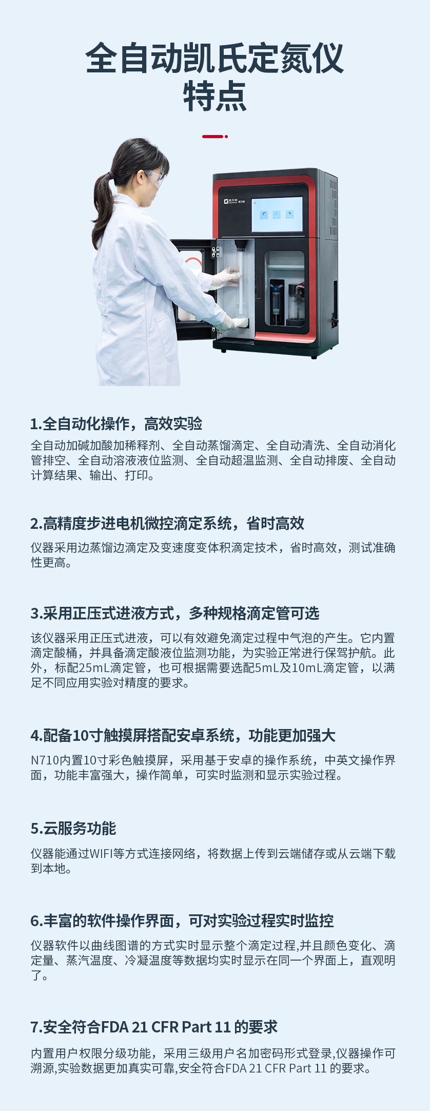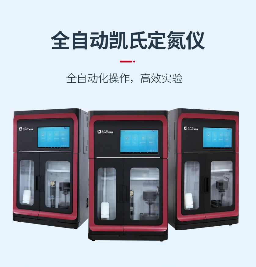 新一代N710全自動凱氏定氮儀集成了自動加堿加酸、自動加稀釋劑、蒸餾滴定、消化管排空、溶液液位監(jiān)測、超溫監(jiān)測、清洗排廢、結(jié)果計(jì)算等功能。采用符合國家標(biāo)準(zhǔn)的凱氏定氮方法:濃硫酸環(huán)境消解樣品、堿性環(huán)境蒸汽蒸餾、硼酸吸收、加指示劑滴定、終點(diǎn)顏色判定法。