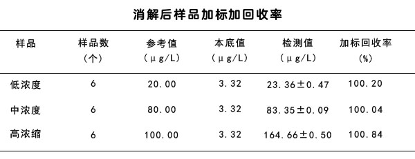 取空白試管18支,分為3組,每組6支,每組分別加入質量濃度為50mg/L的錫標準儲備液0.01、0.04和0.08mL,隨后以尿液定容至2.50mL,配制成錫質量濃度分別為200.00、800.00和l600.00μg/L的低、中、高質量濃度尿液樣品,按照上面的方法采用石墨消解儀進行消解并稀釋10倍,1d內測定完畢,計算加標回收率和精密度結果如下表。