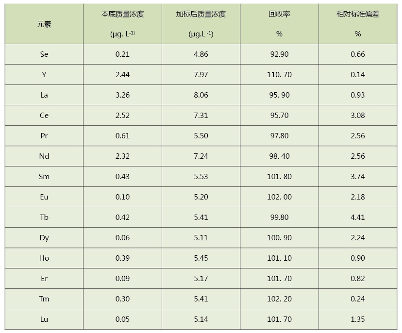 從表中可以看出,使用該方法消解茶葉測定其中的稀土含量,具有很好的回收率和精密度,加標回收率和精密度(RSD)分別為92.9%~110.7%和0.24%~4.41%,實驗結(jié)果滿足要求,該方法可靠,同時適用于其它植物類的應(yīng)用。