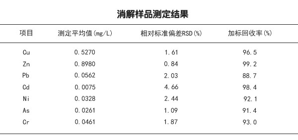 將采集的滲濾液樣品分為若干份,每份的體積大于400mL,分別量取50mL和25mL進行電熱板消解。消解后的樣品用ICP進行3次測定,測定結(jié)果進行平均值和相對標(biāo)準(zhǔn)偏差計算。剩余的樣品再次量取50mL和25mL,加入標(biāo)準(zhǔn)物質(zhì),加標(biāo)量范圍控制在樣品中待測物含量的0.5~2.0倍,加標(biāo)體積盡可能小。然后將加標(biāo)的樣品按進行陶瓷電熱板消解。消解后的樣品用ICP進行測定,測定結(jié)果進行加標(biāo)回收率計算。測定結(jié)果見下表格。