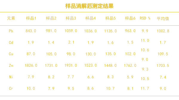 精密度實驗用來考察方法檢測樣品的重現(xiàn)性和準確性,將12組平行樣品分成兩組進行測定得出數(shù)據(jù),結(jié)果見表(平行樣品消解測定結(jié)果表)。經(jīng)過實驗室電熱板消解的樣品其六種金屬元素鉛、鎘、銅、鋅、鎳、鉻的相對標準偏差在9.9%-17.3%之間。