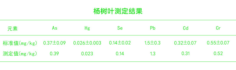 對國家標準物質楊樹葉按以上實驗電熱板濕化消解的方法處理后,按上述分析條件分別進行多次檢測,并用一次消解進行多種重金屬檢測共7次的結果。