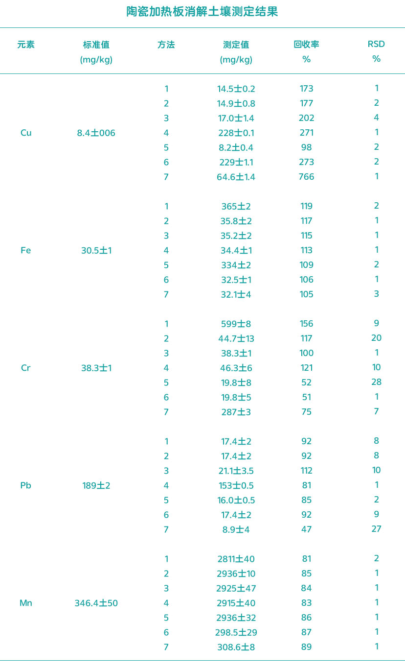 實驗中采用新型陶瓷加熱板對土壤進行HNO3+HF+HCLO4酸體系消解方法,消解過程中對不同酸量的控制,觀察分析土壤中重金屬的不同影響,方法僅供參考。新型陶瓷加熱板大加熱面積有助消解使用批量處理,遠程數控控制器精準對溫度進行調控,擺脫傳統電熱板的費時多、低效率的操作。