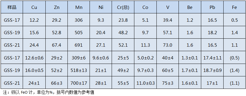 用HCl+HNO3+HF+HC104四酸全消解體系通過陶瓷電熱板濕法消解土壤樣品,進行3種不同加酸過程對GSS-17、GSS-19和GSS-21標準土壤樣品進行3次平行預(yù)處理,測定土壤中銅、鋅、錳、鎳、總鉻、鉆、釩、鈹、鉛、鐵l0種重金屬元素,結(jié)果如下表所示。