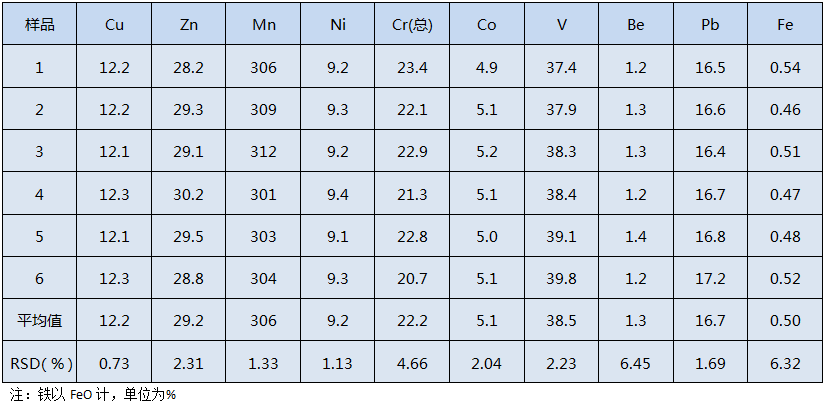 從上表結(jié)果得出,各元素的相對標準偏差在0.73%~6.45%之間,符合實驗室要求,方法適用于環(huán)境樣品預(yù)處理。